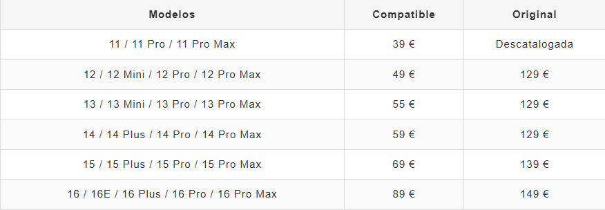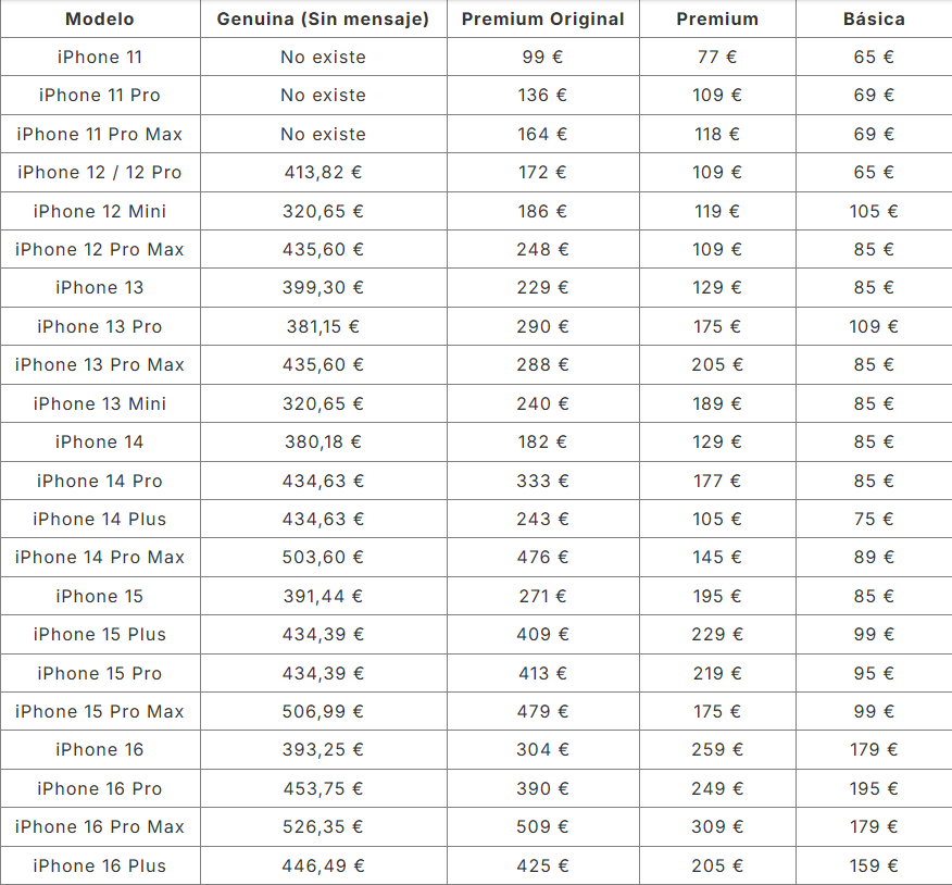 • El cambio de bateria en el iPhone 11 / 11 Pro / 11 Pro Max es de 55€ (compatible), en el iPhone 12 / 12 Pro / 12 Pro Max es de 69€ (compatible), en toda la gama de iPhone 13 y iPhone 14 es de 69€ (compatible). Si quiere saber el precio exacto llámenos.